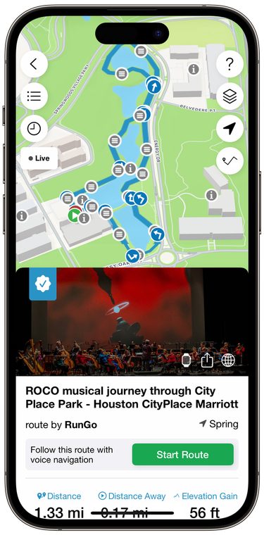 Visitors can access the 1.3-mile route by scanning a QR code available at the adjacent Houston City Place Marriott, or by searching within the RunGo app’s City Place page, which provides a range of community trail options, albeit without the same musical accompaniment for now. The circular route begins and ends just steps from the Marriott’s lobby on programmed City Plaza.