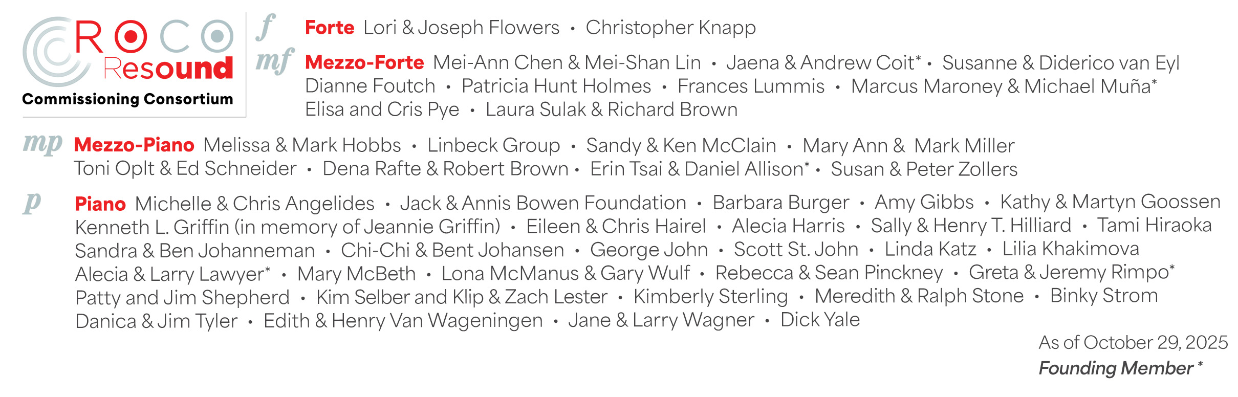 Make a resonating impact towards shaping the future of classical music with us by joining ROCO Resound! This consortium dedicated to supporting ROCO’s commissions brings together like-minded individuals to invest in the creation of new music. Membership starts at just $250 quarterly.